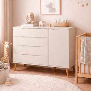 O modelo conta com gavetas amplas, ideais para roupas, acessórios e itens pessoais, além de um compartimento lateral com porta, perfeito para acomodar calçados ou objetos maiores de forma discreta e organizada.