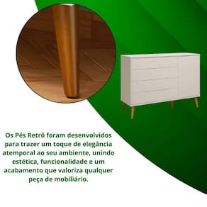 Os puxadores usinados garantem um visual contínuo e elegante, enquanto os pés em madeira elevam o móvel do chão, facilitando a limpeza e acrescentando charme ao design.