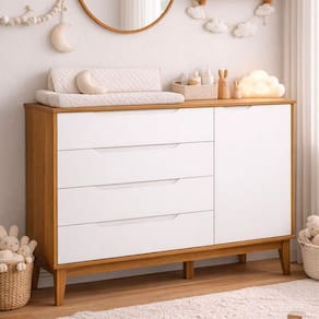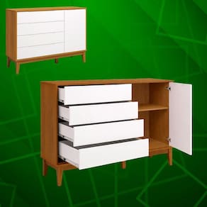 O modelo conta com gavetas amplas, ideais para roupas, acessórios e itens pessoais, além de um compartimento lateral com porta, perfeito para acomodar calçados ou objetos maiores de forma discreta e organizada.