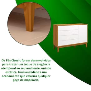 Os puxadores usinados garantem um visual contínuo e elegante, enquanto os pés em madeira elevam o móvel do chão, facilitando a limpeza e acrescentando charme ao design.