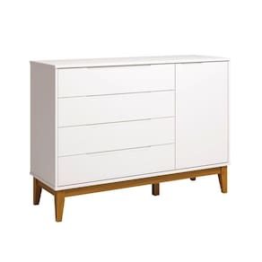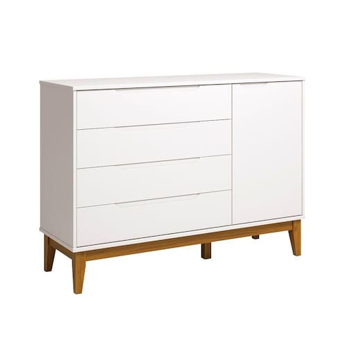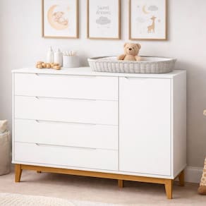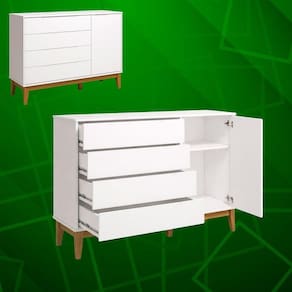 O modelo conta com gavetas amplas, ideais para roupas, acessórios e itens pessoais, além de um compartimento lateral com porta, perfeito para acomodar calçados ou objetos maiores de forma discreta e organizada.