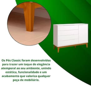 Os puxadores usinados garantem um visual contínuo e elegante, enquanto os pés em madeira elevam o móvel do chão, facilitando a limpeza e acrescentando charme ao design.
