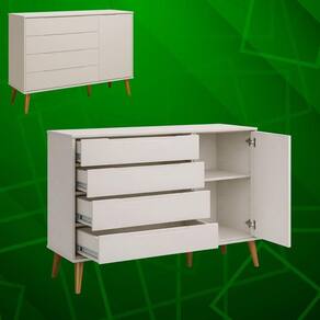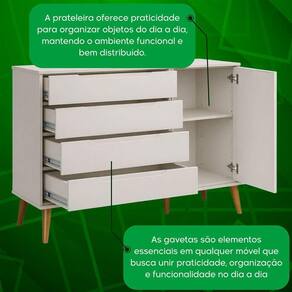 O modelo conta com gavetas amplas, ideais para roupas, acessórios e itens pessoais, além de um compartimento lateral com porta, perfeito para acomodar calçados ou objetos maiores de forma discreta e organizada.