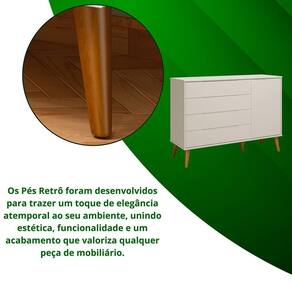 Os puxadores usinados garantem um visual contínuo e elegante, enquanto os pés em madeira elevam o móvel do chão, facilitando a limpeza e acrescentando charme ao design.