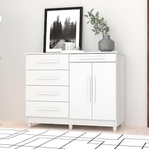 Produzido em MDP, Possui 2 Portas, Pés de madeira opcional na montagem, Puxadores em MDF e ainda conta com 5 Gavetas.