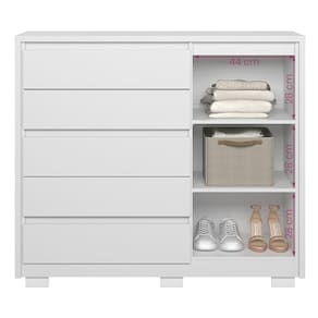 Modelo: Cômoda Sapateira Duetto; Material: MDP; Altura: 109 cm; Largura: 125 cm; Profundidade: 43 cm; Quantidade de gavetas: 05; Tipo de corrediças: Telescópica; Quantidade de portas: 01, com efeito ripado; Tipo de dobradiça: Metálica slow motion; Com puxador: Sim, MDF revestido; Com pés: Sim, 06 plásticos; Prateleira: 02; Peso suportado: até 49 kg distribuídos; Requer montagem: Sim (kit montagem incluso); Embalagem do envio: Papelão e plástico.