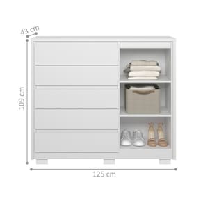 MATERIAL PRINCIPAL: MDP | QUANTIDADE DE PORTAS: 1 | DESCRIÇÃO DO TAMANHO: 109x125x43 cm | PESO PRODUTO COM EMBALAGEM (KG): | ALTURA DO PRODUTO COM EMBALAGEM (CM): | LARGURA DO PRODUTO (CM): 125 | INSTRUÇÕES/CUIDADOS: Limpar com pano macio e seco, não utilizar produtos abrasivos | CONTEÚDO DA EMBALAGEM: 1 Cômoda | COR PREDOMINANTE: Branco | LARGURA PRODUTO COM EMBALAGEM (CM): | COMPRIMENTO PRODUTO COM EMBALAGEM (CM): | MATERIAL PARA FILTRO: MDP | QUANTIDADE DE GAVETAS: 5 | COMPRIMENTO DO PRODUTO (CM): 43 | PESO DO PRODUTO (KG): | ESTADO DE ORIGEM: PR | PRODUTO: Cômoda | ALTURA DO PRODUTO (CM): 109 | PRODUTO PRECISA DE MONTAGEM?: Sugerimos a contratação de um montador para a montagem do produto. Não nos responsabilizamos por causadas no ato da montagem. | CORES DO PRODUTO (FILTRO DE CORES): Branco