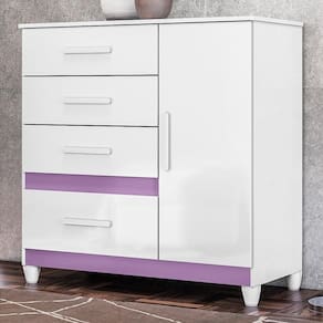 Cômoda Sapateira Vênus 1 Porta E 4 Gavetas Flex Branco/lilás Com Pés - Moval Branco/lilás Cômoda Sapateira Vênus 1 Porta e 4 Gavetas com Pés - Moval A Cômoda Sapateira Vênus é uma peça que combina funcionalidade e elegância para o seu quarto. Com estrutura robusta em MDP e acabamento em pintura UV, ela oferece durabilidade e um visual sofisticado. A Cômoda Vênus conta com 1 porta equipada com dobradiças metálicas e uma prateleira interna que proporciona organização extra. Além disso, suas 4 gavetas com corrediças metálicas garantem um deslizar suave e armazenamento eficiente. Os puxadores em MDF adicionam um toque de charme, enquanto o tampo espaçoso oferece praticidade para você acomodar diversos objetos. A Cômoda Sapateira Vênus é a escolha perfeita para quem busca qualidade e estilo em um só móvel. ESPECIFICAÇÕES: - Estrutura em MDP - Pintura UV - 1 Porta - Dobradiças metálicas - Prateleira interna - 4 Gavetas - Corrediças metálicas - Puxadores em MDF - Tampo com amplo espaço - Pés em PVC