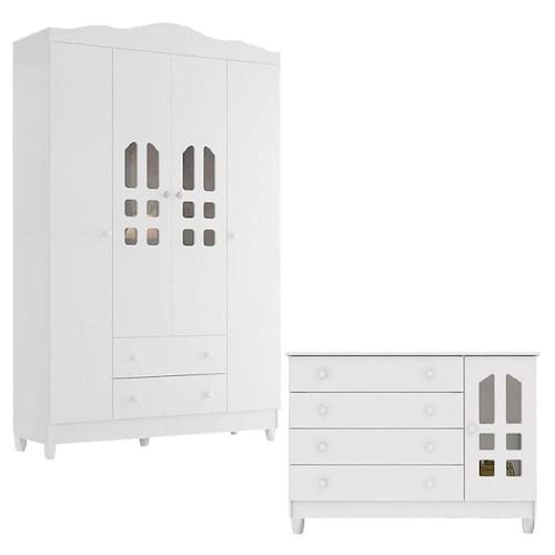 Cômoda Selena e Guarda Roupa Infantil New Selena 4 Portas Branco Brilho Carolina