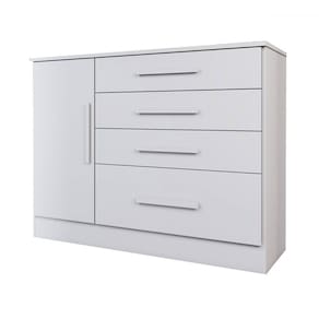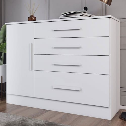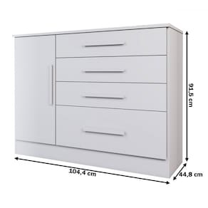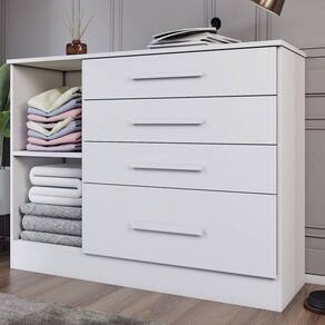 O(a) Cômoda Summit 1 Porta 4 Gavetas Neve - Loja é produzido em MDP na escala de brilho Fosco e Semi-Brilho, e possui um grau de dificuldade de montagem: Médio.