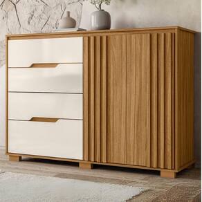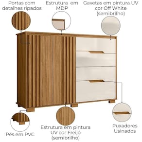 Cômoda Texas alia funcionalidade e design moderno para organizar seu ambiente com estilo. Estrutura em MDP (gavetas e tampo 15 mm / base e fundo 12 mm) com acabamento em pintura UV. Composta por 4 gavetas (sendo 1 gavetão) equipadas com corrediças metálicas, portas com detalhes ripado (baixo relevo) equipadas com dobradiças (35mm) com amortecedor, puxadores em cava e pés em PVC. Este produto será entregue em 02 volumes.