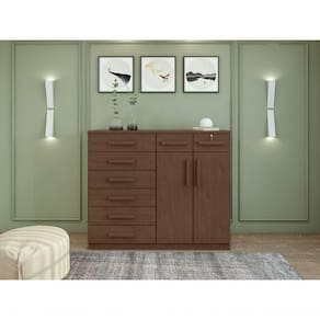 Produto em MDP; Pintura e acabamento em micro textura; Puxadores em MDF; 08 gavetas; Gaveta com chave; Gavetas com corrediças telescópicas; 02 portas com prateleiras internas; Tampo de 25mm; Fundo das gavetas e costas em HDF. Vantagens/Benefícios: Produzido com equipamentos de alta tecnologia; Produto avaliado e aprovado por um rigoroso controle de qualidade; Fácil montagem e manual de montagem simplificado; Design minimalista; Acabamento com toque aveludado; Gavetas ideais para acomodação das roupas em maiores quantidades; Gavetas grandes e espaçosas com corrediças telescópicas; Tampo de 25mm para maior resistência; Portas com puxador para melhor acesso às prateleiras internas; Prateleiras internas para sapatos.