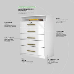 E esse não é o único diferencial da Cômoda Triunfo, ela tem espaço dedicado aos itens que você gosta de deixar sempre à mão e também, gavetas com dimensões diferentes para organizar desde peças de roupas que não precisam de cabides, roupas íntimas, de cama e banho.