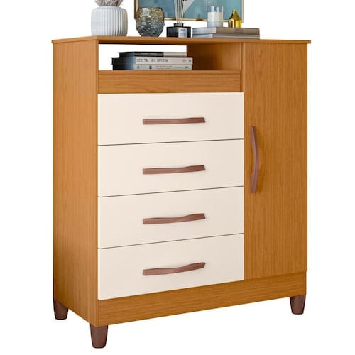 ESPECIFICAÇÕES: Estrutura em MDP Pintura UV 1 Porta Dobradiças metálicas Interna com prateleira 4 Gavetas Corrediças metálicas Puxadores em ABS Pés em ABS