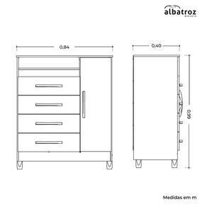 Características do Produto: Marca: Albatroz Modelo: Turquesa Material do Produto: MDP Material da Porta: MDP Tipo de Pintura: Pintura UV Acabamento da Pintura: Fosco/brilho Material do Puxador: ABS Tipo de Gaveta: Externa Tipo de Corrediça: Metálica Tipo de Porta: Bater Tipo de Dobradiça: Metálica Material dos Pés: ABS Possui Gavetas: Sim Q. de Gavetas: 4 Possui Portas: Sim Q. de Portas: 1 Possui Prateleiras: Sim Q. de Prateleiras: 1 Possui Pés: Sim Q. de Pés: 4 Necessita Montagem: Sim Peso Suportado Pelas Gavetas -kg-: 5 Complexidade de Montagem: Alta Complexidade. Recomendasse a Contratação de Montador Profissional. Manutenção e Limpeza: Limpar Com Flanela ou Pano Macio Seco, Não Utilizar Produtos Abrasivos, Desengordurantes, Álcool ou Solvente. Não Expor o Produto Diretamente à Luz Solar e à Umidade.