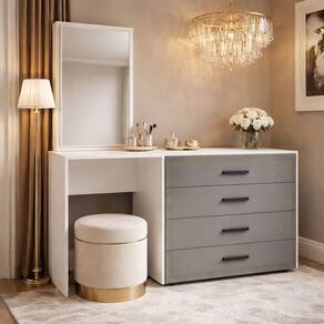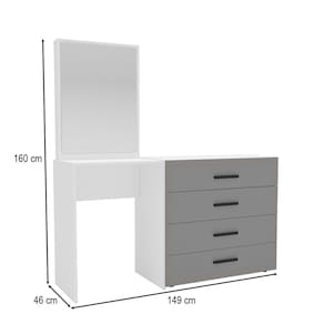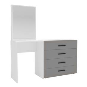 O(a) Cômoda Valência 4 Gavetas com Espelho Cinza/Branco - Politorno é produzido em MDP na escala de brilho Semi-Fosco, e possui um grau de dificuldade de montagem: Médio.