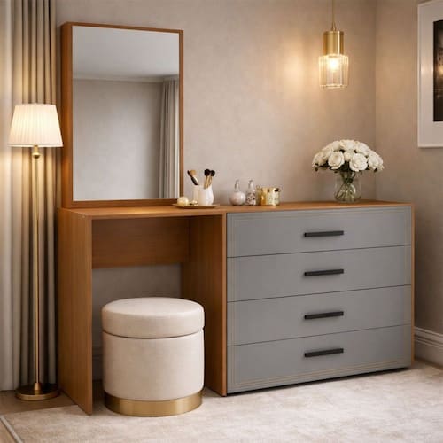O(a) Cômoda Valência 4 Gavetas com Espelho Cinza/Freijó - Politorno é produzido em MDP na escala de brilho Semi-Fosco, e possui um grau de dificuldade de montagem: Médio.