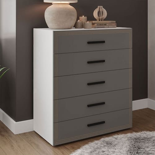 O(a) Cômoda Valência 5 Gavetas Branco/Cinza - Politorno é produzido em MDF e MDP na escala de brilho Semi-Fosco, e possui um grau de dificuldade de montagem: Médio.