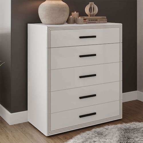 O(a) Cômoda Valência 5 Gavetas Branco - Politorno é produzido em MDF e MDP na escala de brilho Semi-Fosco, e possui um grau de dificuldade de montagem: Médio.