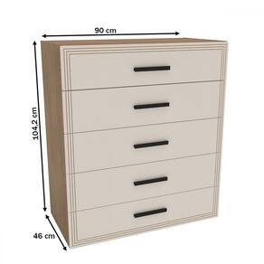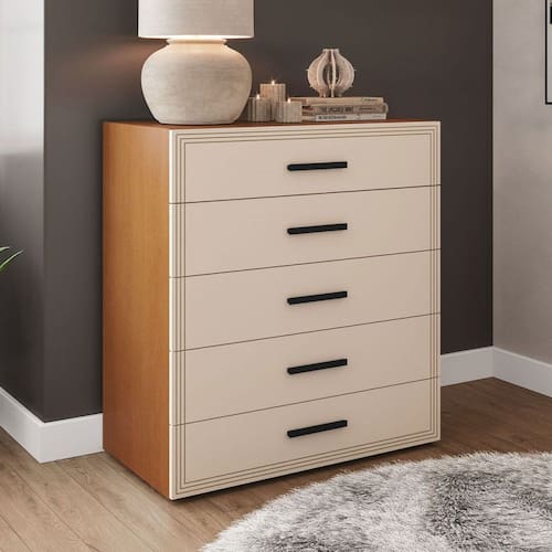 O(a) Cômoda Valência 5 Gavetas Creme/Freijó - Politorno é produzido em MDF e MDP na escala de brilho Semi-Fosco, e possui um grau de dificuldade de montagem: Médio.
