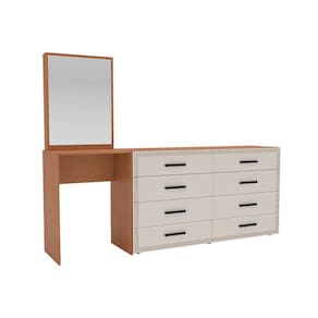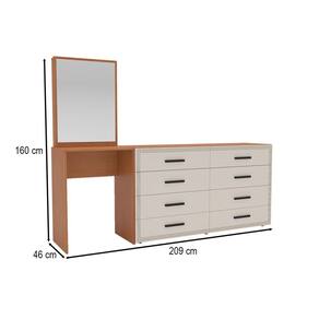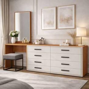 O(a) Cômoda Valência 8 Gavetas com Espelho Creme/Freijó - Politorno é produzido em MDP na escala de brilho Semi-Fosco, e possui um grau de dificuldade de montagem: Médio.