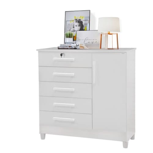 Cômoda 5 Gavetas 1 Porta Vitória Rud RackA Cômoda 5 Gavetas 1 Porta Vitória Rud Rack foi desenvolvida para pessoas de bom gosto e que precisam de móveis funcionais e de custo benefício. Esta cômoda possui cinco amplas gavetas fáceis de abrir, uma porta lateral com prateleira interna para que os pertences sejam bem acomodados. Aproveite!Medidas:Altura: 93 cmLargura: 99 cmProfundidade: 47 cm– Produto em MDP e MDF– 05 Gavetas com corrediças metalicas– Prateleira Interna– 04 pés em pvc