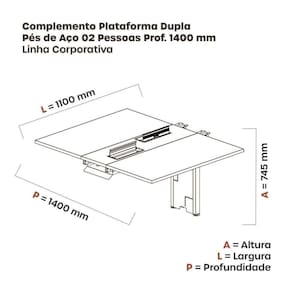 Complemento de mesa plataforma Para Coworking para 2 pessoas é uma ótima opção para quem busca um ambiente de trabalho moderno, funcional e confortável. Esse complemento de mesa possui uma estrutura de aço resistente e elegante, com espaço para a instalação de tomadas e conectores. Além disso, é permitindo adequar com mais plataformas para criar uma interação dinâmica e colaborativa, transfonando seu espaço de trabalho produtivo, criativo e agradável. Acompanha Manual de Instalação: Sim Ambiente Principal: Escritório Complexidade da Montagem: Baixa: pode ser montado por uma pessoa sozinha Cor: Nogueira casblanca/Preto Cor da Base: Preto Cor do Produto: Nogueira casblanca/Preto Cor do Tampo: Bege Cor Flex: Não Cor Interna: Nogueira casblanca/Preto Dobrável: Não Escala de Brilho: Semi-Fosco Espessura do Tampo: 25 Formato: Retangular Itens Inclusos: 1 complemento Mesa plataforma Linha ou Coleção: Linha Corporativa Manual de Montagem e Instalação: https://cdn2.madeiramadeira.com.br/prd/pandin/1730273-Plataforma%20e%20Complemento%20Duplo%20P%C3%A9%20Painel.pdf Material da Estrutura: Aço Material do Tampo: MDP Material dos Pés: Polipropileno Material Principal: MDP Montagem Flex: Não Necessita Montagem: Sim Origem do Produto: Nacional Peso: 35.994 Possui Painel: Não Possui Passa Cabos: Não Possui Porta Objetos: Não Possui Portas: Não Possui Prateleiras: Não Possui suporte para CPU: Não Possui Suporte para Teclado: Não Possui Vidro: Não Recomendações de Uso, Manutenção e Limpeza: Utilize pano úmido com para limpeza Sapatas Niveladoras: Sim Sistema de Montagem: Parafuso Suporta Até (kg): 30