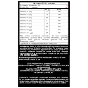 Benefícios - apenas 1 cápsula ao dia; - 60 doses/porções por frasco; - cada dose/porção 1 cápsula fornece 100% da idr; - auxilia no metabolismo energético; - auxilia no metabolismo de proteínas, carboidratos e gorduras; - contribui para a manutenção da pele, olhos e cabelos; - ajuda na atividade física; - não contém glúten.