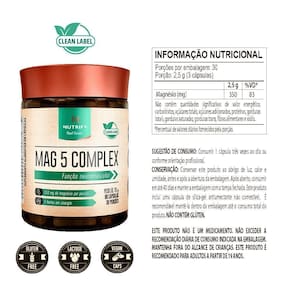 Mag 5 complex oferece cinco fontes de magnésio, cada uma atuando de forma otimizada em diversos processos metabólicos do organismo. Dentre os quais podemos destacar o metabolismo energético, equilíbrio dos eletrólitos, funcionamento neuromuscular e a formação de ossos e dentes. Mag 5 complex é um aliado na sua rotina nutricional, garantindo a ingestão adequada deste mineral tão fundamental. E a combinação sob a forma de quelatos, proporciona alta absorção e melhor biodisponibilidade.Ingredientes: bisglicinato de magnésio, dimagnésio malato, sais de magnésio do ácido cítrico citrato de magnésio , taurato de magnésio, ascorbato de magnésio, agente de massa celulose microcristalina, lubrificante estearato de magnésio, antiumectante fosfato tricálcico, estabilizante hidroxipropilmetilcelulose, glaceante carragena, regulador de acidez acetato de potássio e corante clorofila cúprica. Não contém glúten. Sugestão de consumo: consumir 1 cápsula ao dia ou conforme orientação profissional. Marca: Não Informado Ean: 7896311777600