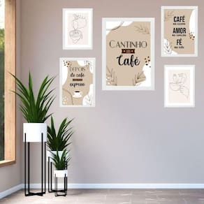 Composição 5 quadros cantinho do café moderno Moldura: madeira branca Informações do produto tire todas as suas dúvidas no descritivo abaixo: decoração para quarto, sala, cozinha, escritório, área gourmet e muito mais. Chega de paredes vazias medidas - kit composto por 5 quadros, sendo 2 quadros com medida 18x24cm, 2 quadros com 24x33cm e 1 quadro com medida 33x45cm. Material do papel - papel fotográfico brilhante de altíssima resolução acabamento - todos os quadros são acompanhados de uma película de acetato para proteção da imagem. - os quadros são embalados de forma segura com plástico bolha com camada dupla de acordo com o tamanho dos quadros. Garantia - garantia de 3 meses. Meu quadro chegou. Como posso fixá-lo Você precisa apenas de um martelo e um prego, pois os quadros já vão acompanhados de penduradores. Esta é a forma mais indicada. Caso prefira, você pode utilizar uma fita dupla face neste caso, sugerimos de alta qualidade para evitar que descole e seu quadro caia . Como posso limpar meu quadro A limpeza é feita como um móvel comum da sua casa. Apenas um pano seco ou espanador são suficientes para tal Ean: 7899051192047