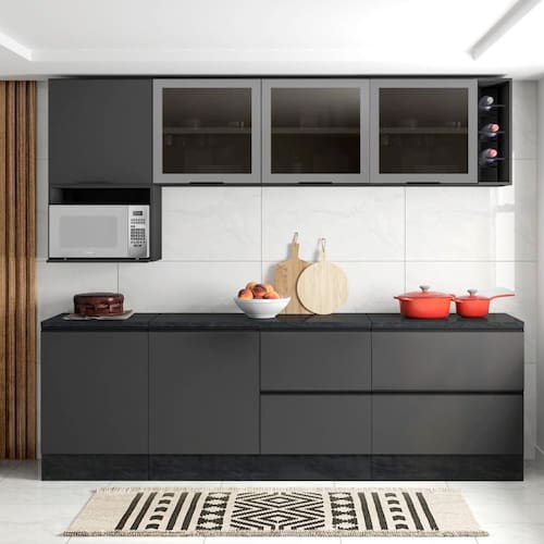 Características do Armário Aéreo 80 cm 1 Porta Vidro Fumê com Adega: Aéreo com prateleira Porta de bater moldurada em vidro fumê Dobradiças resistentes de 35mm com a função slow motion Adega para 6 garrafas, puxador em metal
