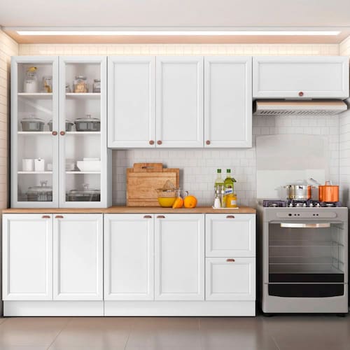 Os armários aéreos, tanto o modelo de três portas quanto o aéreo sobre geladeira, são ideais para quem precisa aproveitar melhor o espaço vertical da cozinha. Com estrutura resistente, prateleiras internas, dobradiças reforçadas e puxadores com acabamento de alta cobertura, garantem beleza e durabilidade. O modelo sobre geladeira, com porta basculante e pistão a gás, oferece abertura suave e segura.