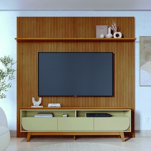 Características: Estrutura em MDP Pintura semi brilho Gavetas com corrediças telescópicas Laterais com detalhe curvo Tampo com borda chanfrada Pés Usinados Espaço para TV até 75 Polegadas.