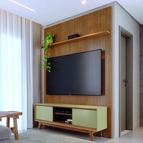Características: Estrutura em MDP Pintura semi brilho Painel em MDF frisado (baixo relevo) Portas Deslizantes Detalhe chanfrado na base e no tampo Pés Usinados Espaço para TV até 65 Polegadas.