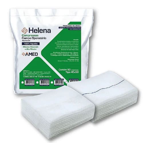 Esta compressa de campo operatório não estéril da marca Helena é a escolha ideal para procedimentos cirúrgicos, oferecendo alta absorção e segurança. Confeccionada em tecido quádruplo sobreposto, 100% algodão, ela é altamente absorvente e possui um dispositivo de fixação duplo em forma de alça, garantindo que as camadas de gaze permaneçam fixas e não deslizem durante o uso.**Especificações Técnicas:**- Dimensões: 45cm x 50cm- Composição: 100% algodão- Camadas: 4 camadas de gaze- Não estéril- Sem fio radiopaco**Funções e Características:**A compressa é projetada para absorver sangue e secreções durante procedimentos cirúrgicos, além de servir como anteparo traumático para vísceras e tecidos. Sua estrutura de quatro camadas proporciona alta absorção, essencial para manter o campo operatório limpo e seguro.**Itens Incluídos:**- Embalagem com 50 compressas**Compatibilidade/Para Quem É:**Ideal para profissionais de saúde que realizam procedimentos cirúrgicos e necessitam de um produto confiável para absorção de fluidos e proteção de tecidos.**Benefícios do Produto:**- Alta absorção devido à sua composição 100% algodão- Estrutura quádrupla que evita o deslizamento das camadas- Dispositivo de fixação duplo para maior segurança durante o uso**Instruções de Uso:**Este produto é de uso único e deve ser destruído após o uso. Não deve ser reprocessado. Certifique-se de que a embalagem não esteja violada, molhada ou danificada antes de utilizar.**Q&A (Perguntas e Respostas):**- **Este produto é estéril?**Não, a compressa é não estéril e deve ser utilizada conforme as instruções de uso.- **Posso reutilizar a compressa?**Não, o produto é de uso único e deve ser descartado após o uso.**Advertências:**- Não utilizar se a embalagem estiver violada, molhada ou danificada.- Produto de uso único, destruir após o uso.- Proibido reprocessar.**Registro ANVISA:** 81481900007Atenção: As cores apresentadas no site são meramente ilustrativas e podem não corresponder com exatidão à tonalidade aplicada. Para mais informações sobre manuseio e cuidados quanto ao uso do produto, consulte o Manual do Usuário.