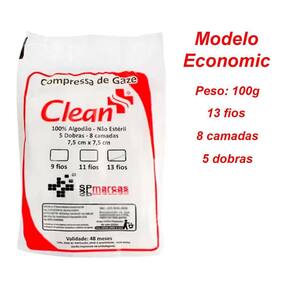 A Compressa de Gaze 13 Fios Clean Economic é ideal para curativos, assepsia e procedimentos médicos em geral. Produzida em 100% algodão, garante suavidade, resistência e alta absorção, tornando-se indispensável em ambientes hospitalares e clínicos. Com 5 dobras e 8 camadas, essa gaze proporciona excelente desempenho na absorção de líquidos e fluídos, assegurando maior eficiência e conforto durante o uso. O tecido de 13 fios oferece durabilidade e praticidade no manuseio. Indicada para limpeza, higienização e cobertura de ferimentos, a Compressa de Gaze Clean é não estéril, podendo ser esterilizada conforme a necessidade do procedimento. Características principais: Composição: 100% algodão puro; Medida: embalagem com 100g; Dobras: 5 / Camadas: 8; Alta absorção e resistência; Registro ANVISA: 81046950003; Uso: hospitalar, clínico e domiciliar. Conserve em local seco e protegido da luz. Descarte após o uso conforme as normas hospitalares. Escolha Clean Economic e garanta qualidade, eficiência e segurança em todos os cuidados médicos e hospitalares. Marca: Não Informado