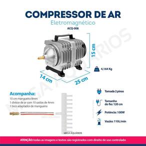 Compressor de ar eletromagnético oxigenador / aerador Boyu ACQ-008 110L/min para lago ou aplicação em indústria, acompanha divisor de ar de 10 saídas O compressor de ar Boyu ACO é fabricado em alumínio injetado, que garante a pressão sem perdas, é um equipamento indispensável para manter os níveis de oxigênio em lagos, além de inúmeras aplicações no setor industrial. O que você precisa saber antes de comprar: Características: Super potente Baixo consumo de energia Extremamente resistente Indicado para oxigenação de grande porte Não gera resíduos de óleo ou lubrificante no ar Ruído alto Motor eletromagnético linear Fluxo intenso e constante de ar Alumínio intejado Pode ficar ligado 24h por dia Saída de ar principal para mangueira de 8mm Acompanha divisor de ar de 10 saídas com saída de ar para mangueira de 4mm Tomada padrão 2 pinos Pés emborrachados evita o deslocamento e diminui o ruído decorrente da vibração do motor Auxilia na oxigenação da água e realiza a troca de gases tóxicos presente na água por meio do movimento gerado pelas bolhas de ar Precisa ficar protegido de sol e chuva Não possui controle de vazão Não acompanha mangueira de silicone de 4mm e pedras porosas Compre nesse anúncio diretamente com um revendedor oficial Sunsun no Brasil. Especificações técnicas: Marca: Boyu ou JAD enviada conforme disponibilidade Modelo: ACQ-008 Dimensões: 14 x 15 x 25 cm Potência: 100W Vazão: 110L/min Saídas de ar principal: 1 Divisor de ar com 10 saídas Pressão: 0.040mpa Tamanho do fio: 120cm Peso: 4,164 Kg Aplicação: Oxigenação de lagos e tanques de criação de peixes Oxigenação de baterias de aquários Enchimento de brinquedo infláveis Enchimento de colchão inflável Para Ferramenta de aplicação de pintura Bolhas de ar em paredes, balcões, tubos com água de festas eventos Hidroponia Máquina de gravação e corte de laser Cervejaria artesanal Envase de bebidas Indústria plástica, psicultura, gráfica, têxtil, química, agrícola e alimentícia. Conteúdo da embalagem: 1 compressor de ar 1 pedaço de mangueira de 8mm 1 divisor de ar com 10 saídas 1 bico adaptador de mangueira 1 manual de instruções Dicas de segurança: 1- Mantenha o compressor de ar sempre acima do nível da água, assim, caso acabe a energia, anula o risco de a água retornar pela mangueira de ar e posteriormente causar um curto-circuito no aparelho. 2- Não estique o fio da tomada completamente, ligue o equipamento sempre deixando uma folga formando uma espécie de barriga no fio, assim, caso escorra água pelo fio, ela não entrará em contato com a água. 3- Deixe em local seco, protegido do sol e chuva. Recomendações para uma maior durabilidade do compressor: Efetuar a limpeza dos acessórios a cada 15 dias Obrigado pela visita e boas compras Atenção Nossas imagens e textos são registrados e com direito de uso reservado a essa loja e as lojas parceiras devidamente autorizadas. Marca: Não Informado