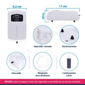 Características: Duração da bateria com carga completa: 20h Ruído médio para alto quando comparado a compressores da mesma potência Botão liga e desliga Led indicativo de carga de bateria Indicativo de bateria abaixo de 20% - led verde piscando Uma saída de ar Baixo consumo de energia Não estressa os peixes Fácil manuseio Bateria de Lithum Utiliza mangueira de ar de 4mm Pés emborrachados evita o deslocamento e diminui o ruído decorrente da vibração do motor Auxilia na oxigenação da água por meio do movimento gerado pelas bolhas de ar Realiza a troca de gases tóxicos presente na água por meio do movimento gerado pelas bolhas de ar Possui dos modos de funcionamento: 1- Intermitente led azul ligado : ele liga e desliga a cada 15 segundos; 2 - Contínuo led azul desligado : o compressor fica ligado direto Não possui regulagem de vazão.