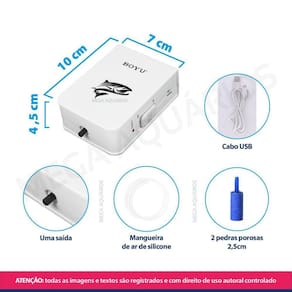 Especificações técnicas: Marca: Boyu Distribuidor: Mega Aquários Modelo: D-300 Voltagem: 110V / 220V - bivolt Potência: 0.4W Vazão: 1X 1,2L/min Saídas de ar: 2 Pressão: 0.01mpa Tamanho: 7 x 4,5 x 10 cm larg x alt x profundidade Peso: 194g Indicado para aquários de até: 50L