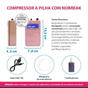 Compressor de ar a pilha com nobreak Boyu liga automaticamente quando ocorrer quedas de energia - acompanha mangueira e pedra porosa Como funciona o compressor de ar a pilha com nobreak NB-200 da Boyu: Basta deixar o compressor DESLIGADO com a pilha instalada e com o aparelho conectado na tomada pelo cabo USB / DC que já acompanha o produto, quando houver interrupção na energia elétrica, ele acionará automaticamente o nobreak e usará a energia da pilha. Importante, ele não possui bateria recarregável, é necessário sempre deixar a pilha instalado no aparelho e o aparelho ligado na tomada. Mantenha sempre acima do nível da água. Características: O compressor de ar a pilha Boyu com nobreack é uma solução simples para manter os níveis de oxigênio em seu aquário quando ocorrer falhas na transmissão de energia elétrica Pode ser também para transporte de iscas e peixes vivos Ruído médio quando comparado a compressores da mesma potência Duração da bateria: varia conforme a qualidade da pilha Botão liga e desliga Uma saída de ar Clip traseiro para fixação Não estressa os peixes Fácil manuseio Auxilia na oxigenação da água por meio do movimento gerado pelas bolhas de ar Realiza a troca de gases tóxicos presente na água por meio do movimento gerado pelas bolhas de ar O cabo USB não serve para recarga de bateria, ele serve para acionar o nobreak quando houver interrupção na energia elétrica Não possui regulagem de vazão Não acompanha fonte de energia, apenas o cabo USB Não acompanha pilha Testado e aprovado por Mega Aquários Compre nesse anúncio com segurança, somos revendedor oficial Boyu no Brasil. Especificações técnicas: Marca: Boyu Revendedor oficial Boyu: Mega Aquários Modelo: NB-200 Voltagem: bivolt Alimentação: 2 pilhas tamanho D não inclusas Potência: 0.5W Vazão: 2L/min ou 120L/h Saídas de ar: 1 Pressão: 0.010mpa Tamanho: 7,8 x 14,5 x 4,5 cm larg x alt x profundidade Tamanho do fio: 100cm Peso: 179g Indicado para aquários de até: 50L Conteúdo da embalagem: 1 Compressor de ar a pilha Boyu NB-200 1m de mangueira de ar de silicone 1 pedra porosa de 4,5cm 1 cabo USB / DC Dicas de segurança: 1- Mantenha o compressor de ar sempre acima do nível da água do aquário, assim, caso acabe a bateria, anula o risco de a água retornar pela mangueira de ar e posteriormente causar um curto circuito no aparelho. 2- Não estique o fio da tomada completamente, ligue o equipamento sempre deixando uma folga formando uma espécie de barriga no fio, assim, caso escorra água pelo fio, ela não entrará em contato com a água. Recomendações para uma maior durabilidade do compressor: Efetuar a limpeza dos acessórios a cada 15 dias. Obrigado pela visita e boas compras ATENÇÃO Nossas imagens e textos são registrados e com direito de uso reservado a essa loja e as lojas parceiras devidamente autorizadas.