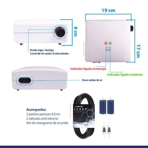 Conteúdo da embalagem: 1 compressor Minjiang MJ-8200D 2 pedras porosas de 4,5cm 2 válvulas anti retorno 4m de mangueira de ar de silicone preta