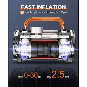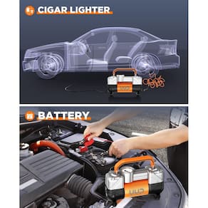 Cilindros duplos resistentes com 12 V CC, bomba de ar de metal para pneus de carro com luz LED de emergência para carro, caminhão, SUV, cama de ar, bote e outros infláveis - Mais eficiente: a bomba de ar de metal de dois cilindros especialmente projetada para caminhões e SUV, com uma pressão máxima de 150psi e um fluxo de ar de 70L/min. Pode inflar pneus 200/70/R18 de 0 a 40 psi em 3 minutos, quatro vezes mais rápido do que um único cilindro - ESTABILIDADE E FÁCIL DE USAR: Surpreendido com seu desempenho eficiente e se beneficia de um bom design térmico, este inflador de pneu funciona de forma estável com baixo ruído e temperatura. Também é tão simples de usar que até mesmo um iniciante pode dominá-lo em cinco minutos - Ampla aplicabilidade: com 4 bicos diferentes, torna-se um bom ajudante para acampar, como almofada de dormir de acampamento, bicicletas de montanha e canoas infláveis, aproveite seus momentos ao ar livre com ele - Portátil e LED: esqueça aqueles itens pesados, basta manter este compressor de ar portátil em seu porta-malas. As luzes LED de emergência ajudarão você na noite escura a verificar a estrada - Qualidade durável:] O pacote inclui 1 compressor de ar portátil, 1 fusível de substituição, 3 adaptadores de bocal, 1 extensor de válvula, 1 conector rápido, 1 bolsa de armazenamento, 1 manual do usuário, 1 cabo de alimentação com grampos de bateria, 1 gancho de limpeza de pneu