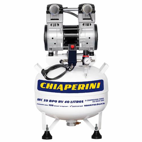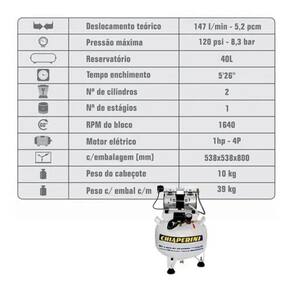 Marca: Chiaperini Modelo: 22492 Voltagem: 220V Deslocamento Teórico 284 l/min – 10 pcm Pressão máxima 120 psi – 8,3 bar Reservatório 40 L Tempo de Enchimento 01 minuto e 53 segundos Nº de Cilindros 2 Cilindros Nº de Estágios 1 Estágio RPM do Bloco 1740 rpm Motor Elétrico 2hp – 1,5 kW – 4P Peso do Cabeçote 19,5kg Peso C/ Embalagem C/ Motor Monofásico (Odonto) 49 kg Dimensões C/ Embalagem C/ Motor Monofásico 560x560x920 mm