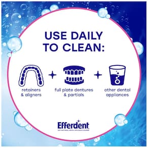 - Use comprimidos de limpeza de retentor efferdent diariamente para limpar retentores, dentaduras de placa completa, parciais, alinhadores e outros aparelhos dentários