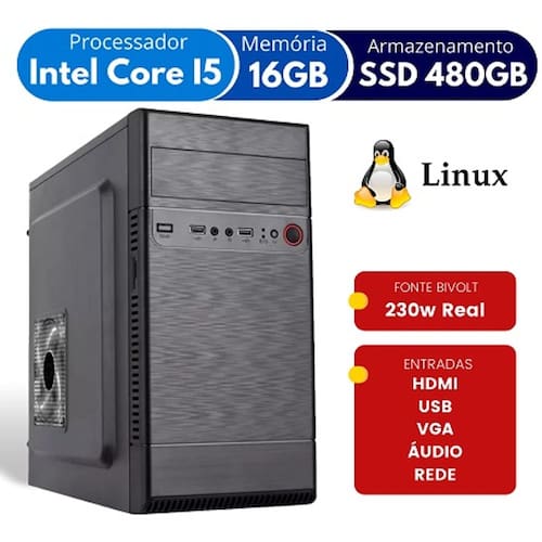 Características técnicas: Processador: Intel Core I5 Quarta Geração Nº de threads 4 Frequência turbo max 3.60 GHz Tecnologia Intel® Turbo Boost frequência 2.0 3.60 GHz Frequência baseada em processador 2.90 GHz Memória Ram: 16 GB DDR3 = 2 pentes de 8 gb Arquitetura da memória: Dual Channel DDR3 Armazenamento: HD SSD 480 GB Video onboard integrado dvdrw: Não Fonte = 230 W Real Acompanha cabo de força Teclado, Mouse, Caixa de som usb: Não acompanha Monitor: não Voltagem: bivolt Sistema operacional: Linux Lite Gabinete: Brazil pc, Conexões: 2x USB 2.0 / 2x Áudio (1 mic/ 1 audio) -Tamanho (Comprimentox Largura xAltura): 380X175X365 mm ATENÇÃO: O MODELO DO GABINETE OU DOS ACESSÓRIOS PODEM VARIAR DE ACORDO COM O NOSSO ESTOQUE , NO ENTANTO, SEMPRE ENVIAREMOS PROD