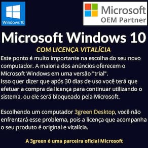 Ao adquirir um computador 3green, você tem a tranquilidade e a comodidade de receber um produto com licença permanente do Microsof Windows 10.