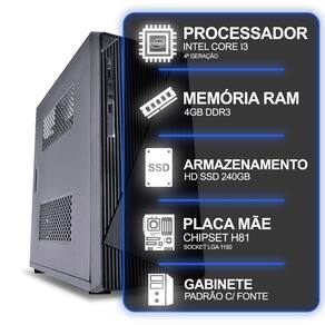 Computador Desktop, Intel Core I3 4º Geração, 4Gb Ram, Hd Ssd 240Gb, Conexões Usb/Vga/Hdmi/Lan/Som Marca: computador desktop intelModelo: gabinete preto atx intel core i3 4 geração Equipamento com suporte e desempenho dentro do esperado para você realizar todas as atividades do seu dia à dia, com fluidez e eficiência em suas tarefas. Possui design moderno e compacto. Execute suas atividades de forma precisa e eficaz, com bom desempenho e baixo consumo de energia. Computador versátil, indicado para o seu entretenimento tais como vídeos, músicas e trabalho ou estudo. Indicado tanto para uso doméstico como uso corporativo. Especificações: Gabinete:Cor: preto Fonte de alimentação bivolt Tipo: torre Placa-mãe:Chipset h81 Conexões usb 2.0/3.0 Hdmi Vga Áudio Porta lan - rj 45 Conector sata iii 2x slots de memoria ram ddr3 Processador:Intel core i3 4 geração Socket lga 1150 Placa de vídeo: Integrada Memoria ram:4gb ddr3 Hd/ssd:Ssd 240gb Sistema operacional:Não acompanha sistema operacional instalado.Compatível com windows xp/7/10 e linux Obs: Imagem ilustrativa do produto, o modelo do gabinete a ser enviado dependerá da disponibilidade no momento da montagem do computador, sempre respeitando o padrão de cor preto e boa qualidade do produto. Não acompanha monitor, teclado, mouse ou caixas de som. Não acompanha gravador de dvd.