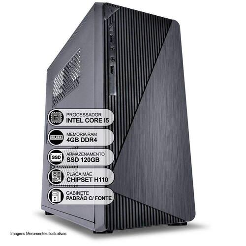 MARCA: COMPUTADOR DESKTOP INTELMODELO: GABINETE PRETO ATX | INTEL CORE I5Equipamento com suporte e desempenho dentro do esperado para você realizar todas as atividades do seu dia à dia, com fluidez e eficiência em suas tarefas. Possui design moderno e compacto. Execute suas atividades de forma precisa e eficaz, com bom desempenho e baixo consumo de energia. Computador versátil, indicado para o seu entretenimento tais como vídeos, músicas e trabalho ou estudo. Indicado tanto para uso doméstico como uso corporativo. ESPECIFICAÇÕES: GABINETE:Cor: PretoFonte de Alimentação BivoltTipo: TorrePLACA-MÃE:Chipset H110Conexões USBHDMIVGAÁudioPorta LAN - RJ 45Conector SATA2x Slots de Memoria Ram DDR4Slot PCI-ExpressPROCESSADOR:Intel Core I5 6 GeraçãoMEMORIA RAM:4GB DDR4HD/SSD: SSD 120GB SISTEMA OPERACIONAL:NÃO ACOMPANHA SISTEMA OPERACIONAL INSTALADO.COMPATÍVEL COM WINDOWS XP/7/10 E LINUXOBS: Imagem ilustrativa do produto, o modelo do Gabinete a ser enviado dependerá da disponibilidade no momento da montagem do computador, sempre respeitando o padrão de cor preto e boa qualidade do produto.Não acompanha Monitor, Teclado, Mouse ou Caixas de Som.Não acompanha Gravador de DVD.