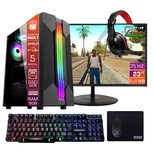 Com o Computador Gamer Ryzen 5 4600g 8GB de Memória SSD 240GB Teclado Mouse Mousepad Headset Gamer gabinete gamer RGB com Windows, Monitor de 23