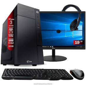 Processador Ryzen 3 3200G com gráficos integrados Radeon Vega 8.Placa-mãe A320.Memória RAM 16GB DDR4.SSD 240GB alta velocidade.Vídeo integrado Radeon Vega Graphics 8.Fonte 230W.Sistema operacional Windows 11 Pro Trial.Monitor 19".